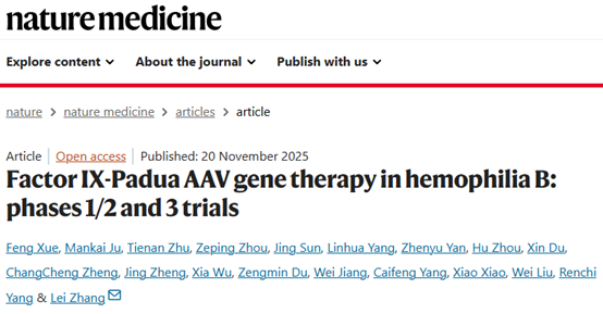日前,啟明創(chuàng)投投資企業(yè)、專注前沿基因治療領(lǐng)域的創(chuàng)新型企業(yè)信念醫(yī)藥宣布,公司研發(fā)生產(chǎn)的基因治療藥物信玖凝?(BBM-H901注射液,通用名稱:波哌達(dá)可基注射液)治療成人血友病B的I/II期和III期(CTR20212816)臨床研究結(jié)果以及研究者發(fā)起的臨床研究(IIT)的長(zhǎng)期隨訪結(jié)果在國(guó)際權(quán)威期刊Nature Medicine(IF=50)正式發(fā)表,題為“Factor IX Padua gene therapy in hemophilia B: phase 1/2 and 3 trials”。該研究由中國(guó)醫(yī)學(xué)科學(xué)院血液病醫(yī)院(中國(guó)醫(yī)學(xué)科學(xué)院血液學(xué)研究所)張磊/楊仁池教授團(tuán)隊(duì)牽頭完成。